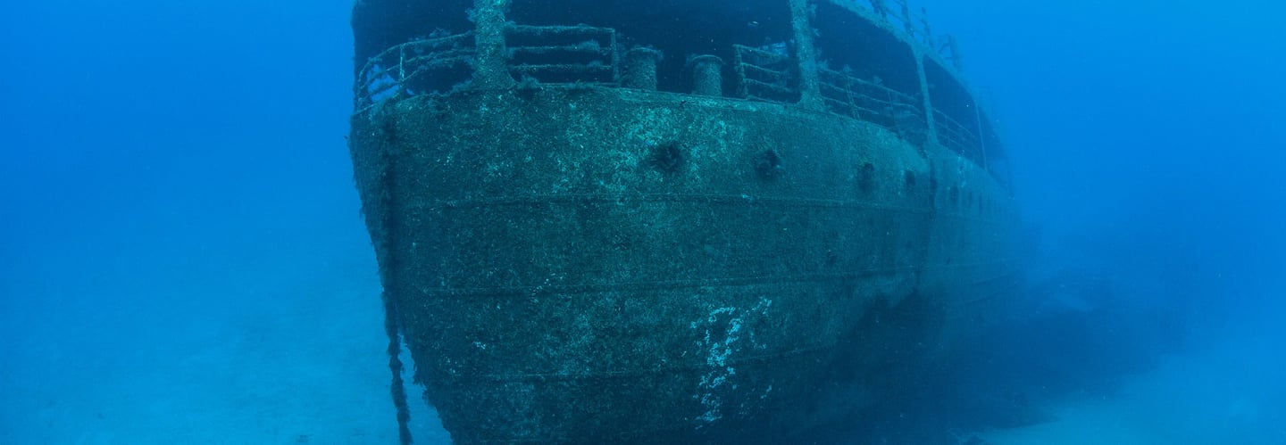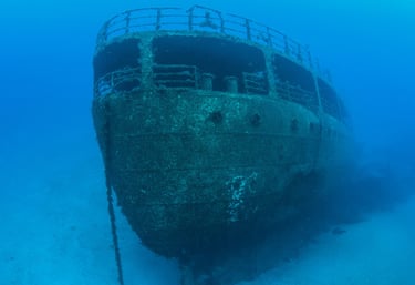Aerial view of a shipwreck submerged in vibrant turquoise and blue waters, surrounded by coral formations and a sandy sea bed.